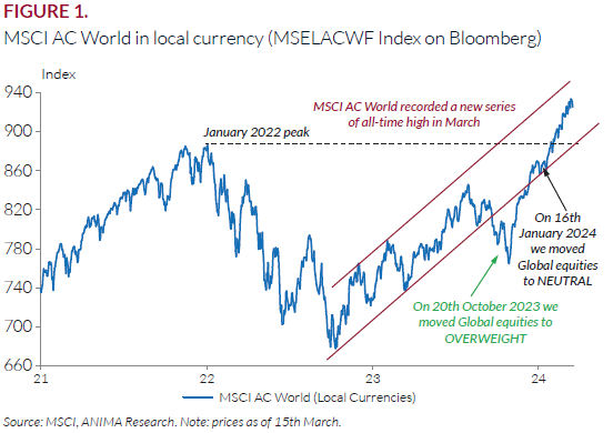 Global benchmark at new record high. The MSCI AC World rebounded c. 20% from last October’s lows reaching a new all-time peak (Figure 1). The rally was mainly led by a combination of declining nominal/real yields and better than expected macro developments.