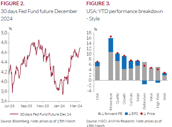 The rally continued despite the sharp market repricing of the Federal Fund Rate (FFR). At the end of December 2023, the rates market expected the FFR at 3.8% by December 2024; now it is forecasted at 4.6%. Such upward revisions did not hit the equity market. Focusing on the US, the star and stripes equity benchmark gained c.7% YTD, of which 5pp came for multiple expansion, and 2pp from EPS. Across the main style and the 24 sectors, only Growth names are grinding higher boosted supported by earnings rather than multiples (Figure 2 and Figure 3).