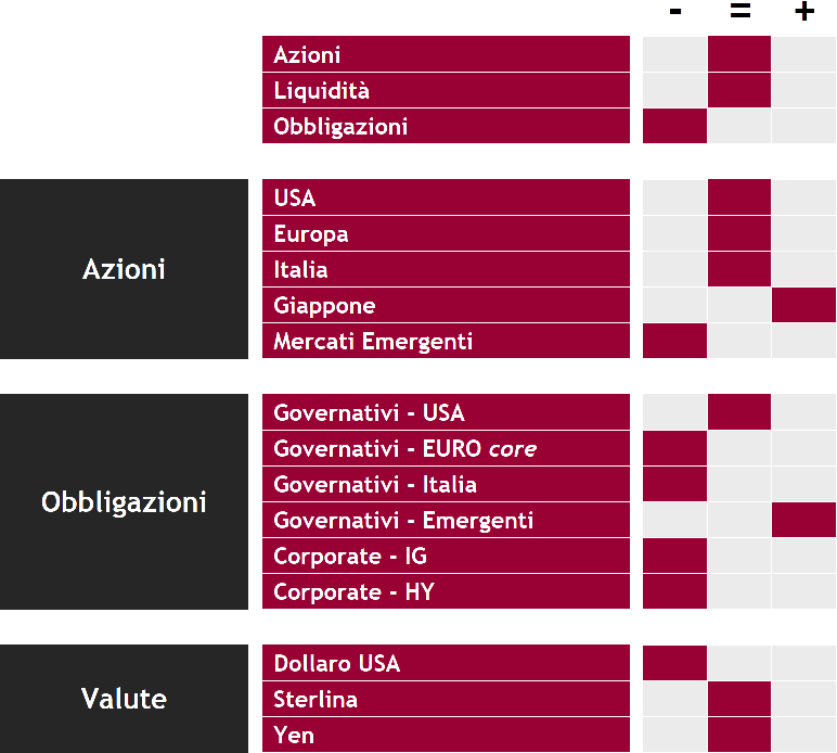 - la view sui mercati azionari si conferma neutrale, in attesa dei prossimi sviluppi riguardanti politiche monetarie, contesto geopolitico ed andamento degli utili societari.