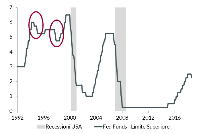 Fonte: elaborazione ANIMA su dati Bloomberg. Cerchiati gli episodi precedenti di “Mid-cycle adjustment” della politica monetaria.