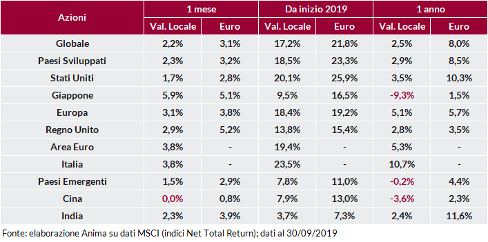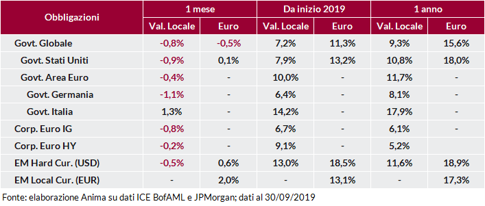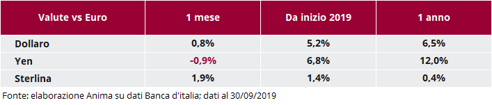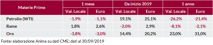In questo contesto, le obbligazioni governative hanno registrato performance negative a livello globale, con i rendimenti in risalita dai valori estremi raggiunti in agosto. Penalizzate da questo movimento anche le obbligazioni societarie Investment-Grade e High-Yield, queste ultime parzialmente protette dal carry positivo. In Italia, al contrario, i BTP hanno continuato a beneficiare degli sviluppi politici ed in particolare dei rapporti distesi tra il nuovo Governo e l’Europa, con il rendimento del decennale italiano che ha toccato nuovi minimi storici a 0,81%.