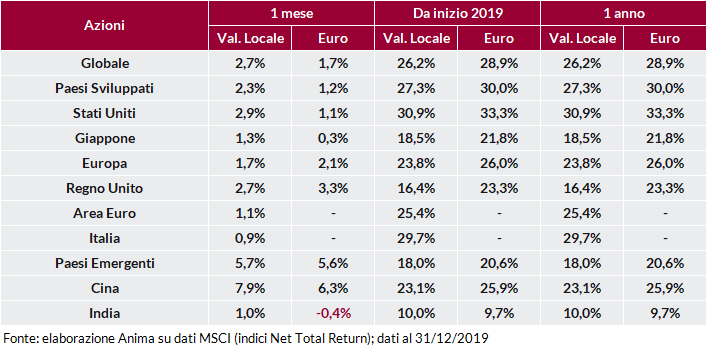 Il ridimensionamento dei rischi geopolitici ha continuato ad alimentare la corsa delle attività rischiose: gli indici azionari globali hanno chiuso il 2019 sui massimi storici.