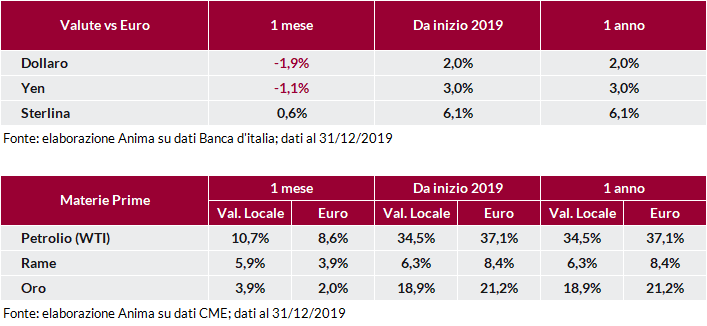 Spread in restringimento per tutti i segmenti del mercato corporate, complice l’aumento generalizzato della propensione al rischio da parte degli investitori; il rendimento a scadenza delle obbligazioni High-Yield in euro è sceso, tornando ai minimi della primavera del 2018 mentre quello del comparto Investment-Grade è rimasto sostanzialmente stabile. Debito emergente in forte apprezzamento grazie alla debolezza del dollaro e all’attenuazione delle tensioni geopolitiche.