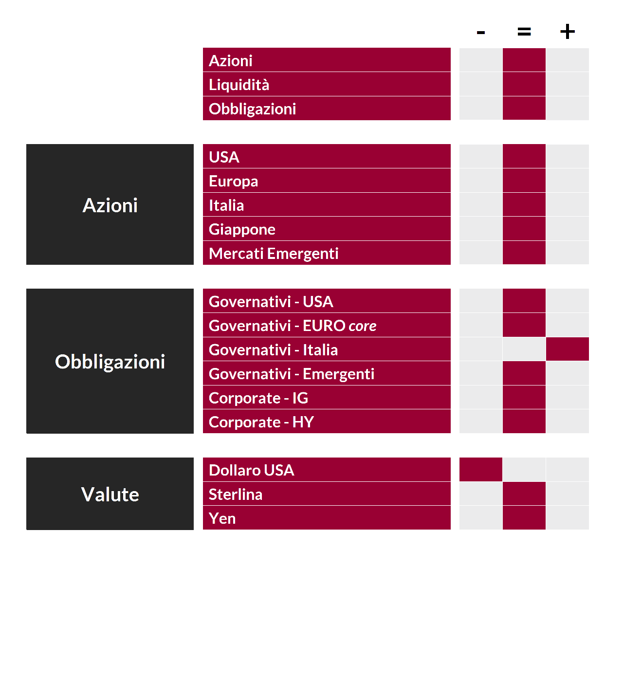 I giudizi espressi non rappresentano indirizzi assoluti di carattere allocativo, bensì un orientamento generale sull'ipotizzabile andamento delle diverse asset class.