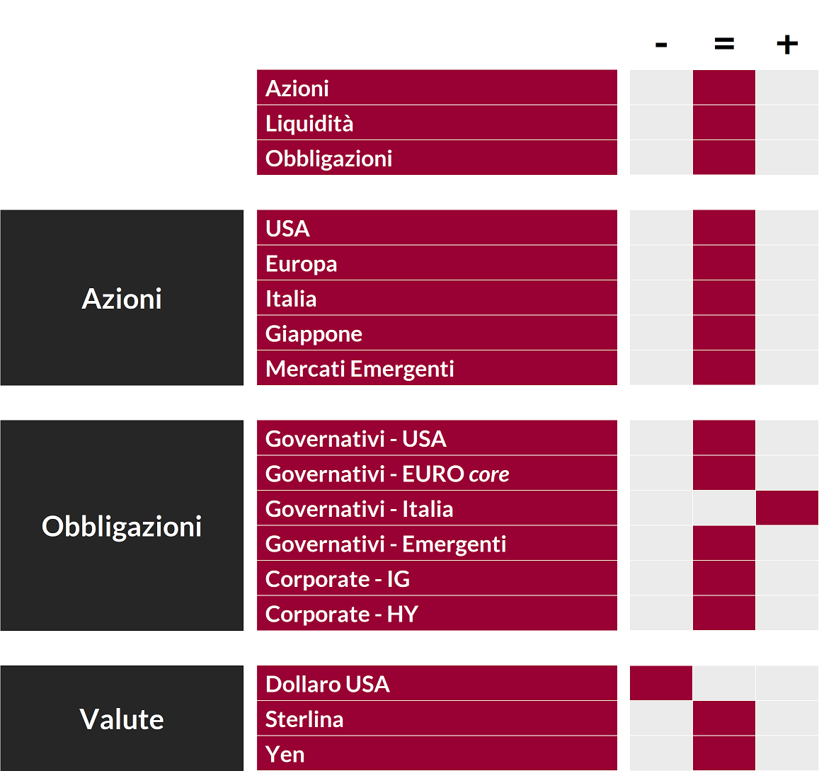 I giudizi espressi non rappresentano indirizzi assoluti di carattere allocativo, bensì un orientamento generale sull'ipotizzabile andamento delle diverse asset class.