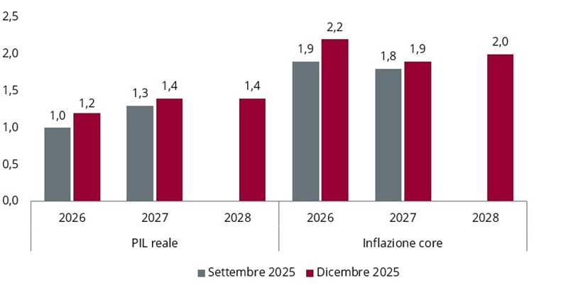 Previsioni BCE sulla dinamica di PIL e inflazione nel triennio 2026-2028​