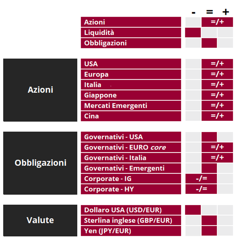 I giudizi espressi non rappresentano indirizzi assoluti di carattere allocativo, bensì un orientamento generale sull'ipotizzabile andamento delle diverse asset class.