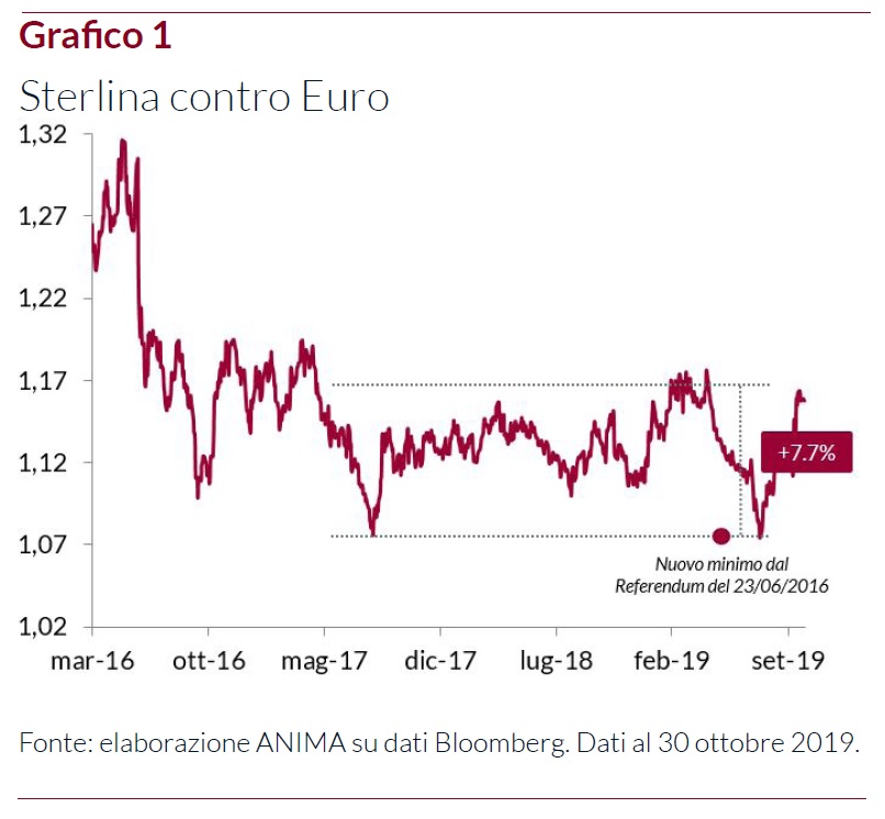 Per quanto riguarda invece Brexit, il raggiungimento di un'intesa fra Boris Johnson e l'Unione Europea rende più improbabile un'uscita disordinata della Gran Bretagna dalla Ue, ma la situazione è in continua evoluzione. Un punto fermo è rappresentato dalla decisione della Ue di concedere la proroga sulla Brexit fino al 31 gennaio 2020. Inoltre, il premier britannico è riuscito a convincere la Camera dei Comuni a dare il via libera per le elezioni il 12 dicembre: dopo il voto occorrerà valutare se si formerà una maggioranza disponibile a confermare l'Accordo stipulato con l'Ue; se ci sarà un Parlamento senza maggioranza; o ancora se si arriverà ad una maggioranza che ha come obiettivo di rimettere tutto in discussione. In ogni caso, la probabilità che si concretizzi una “Hard Brexit" si è ridotta drasticamente: il Premier ha dichiarato che il Regno Unito lascerà la Ue con il suo accordo, “in un modo o nell'altro", e i laburisti hanno sempre sostenuto un'uscita ordinata. Non stupisce dunque l'apprezzamento delle attività finanziarie inglesi avvenuto in concomitanza con il recente allentamento delle tensioni: dal 9 ottobre la Sterlina si è rafforzata (Grafico 1) di oltre il 4% rispetto all'Euro (e di quasi l'8% dalla fase più acuta dello scontro fra le parti, ad inizio agosto). Rilevanti anche gli impatti su scala globale: negli ultimi trimestri l'escalation del rischio geopolitico ha pesato gravemente sullo scenario economico/finanziario e il suo allentamento non può che essere un fattore di supporto per le attività rischiose.