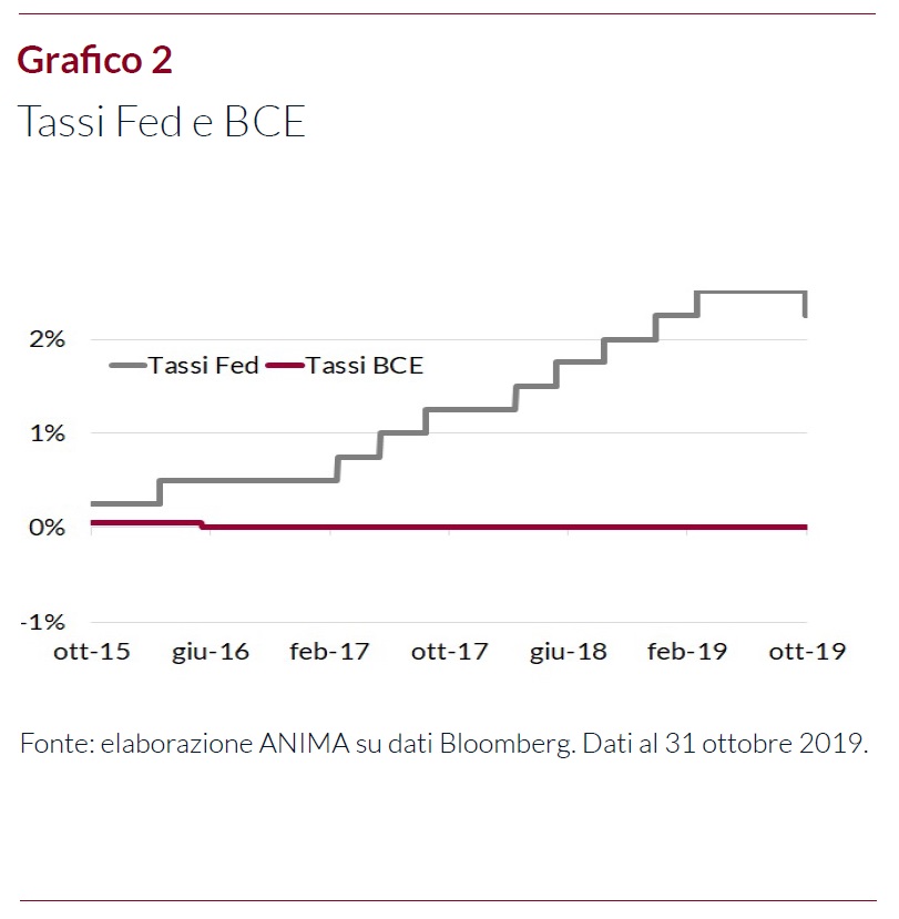 Anche la Federal Reserve, il 15 ottobre, ha ricominciato a fornire liquidità al mercato, attraverso l'acquisto di titoli a brevissimo termine, per un ammontare approssimativo di 60 miliardi al mese, “almeno fino al secondo trimestre del prossimo anno" e con l'obiettivo di “riportare il bilancio delle riserve su un livello ampio", pari o superiore a quello di inizio settembre 2019". Inoltre, in occasione della riunione del 30 ottobre, la Fed non ha deluso le aspettative degli analisti, procedendo al terzo taglio del costo del denaro di quest'anno (di 25 punti base) - invocando fra le motivazioni, “gli investimenti fissi delle imprese e le esportazioni" che “rimangono deboli" - portando così i tassi di interesse nell'intervallo dall'1,5% all'1,75% (Grafico 2). Riflettori puntati, a questo punto, sull'evoluzione del quadro economico: la minore incertezza sul fronte geopolitico e il permanere di politiche monetarie decisamente accomodanti a livello globale dovrebbero consentire di archiviare l'attuale fase come un rallentamento di metà ciclo. Sorvegliati speciali, soprattutto, gli eventuali segnali di ripresa del settore manifatturiero e l'andamento di consumi e servizi, fino ad oggi rimasti relativamente solidi.