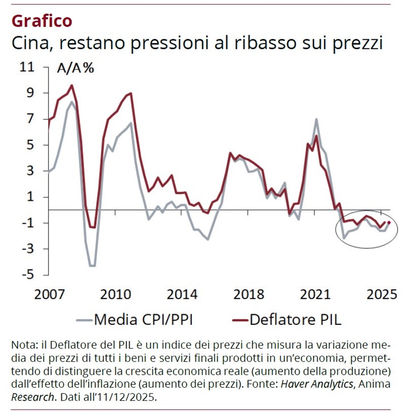 Negli USA manteniamo l'aspettativa che l'inflazione core raggiunga il target della Federal Reserve entro fine 2026, ipotizzando che lo shock legato alle tariffe sia transitorio e il trend disinflazionistico dei servizi si consolidi, mentre in Area Euro dovrebbe scendere sotto il target nel 2026: la disinflazione sarà sostenuta dal reset dei prezzi e dal rallentamento salariale. In Cina, nonostante maggiori stimoli pubblici, la domanda interna resta debole e le pressioni deflazionistiche rimangono radicate (Grafico). Ci aspettiamo che l'inflazione rimanga ben al di sotto dell'obiettivo della Banca Popolare Cinese.